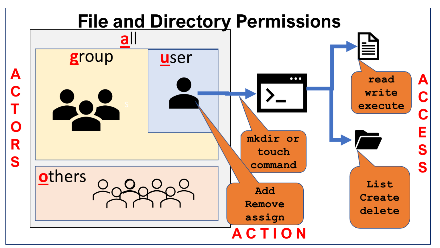 The abbreviations listed in the actors, access and actions tables below are used in the commands related to granting or revoking permission to files and directories.