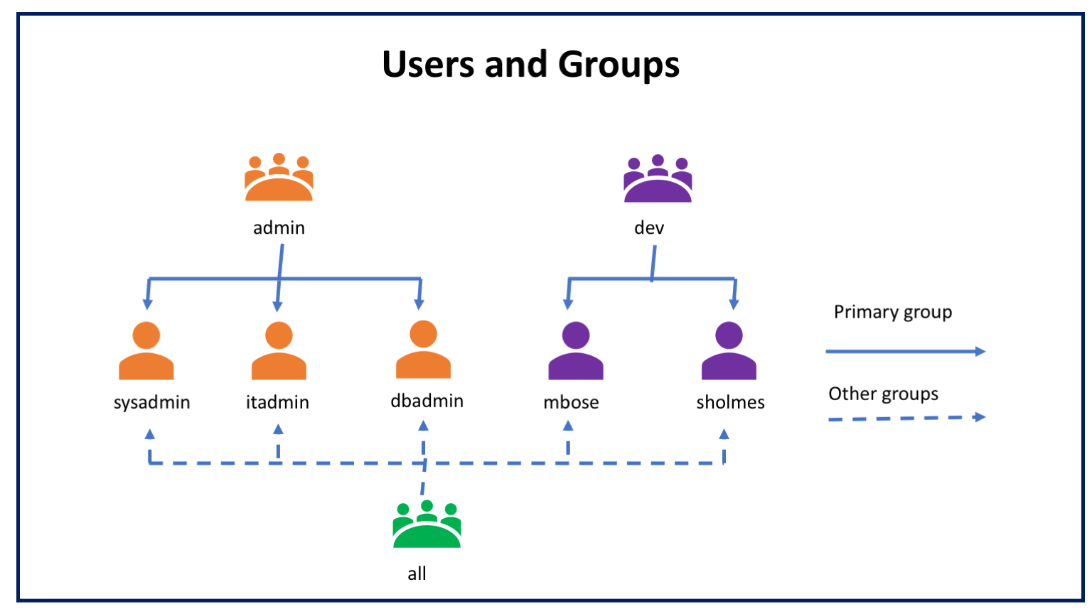 $ sudo useradd itadmin -d /home/itadmin -g admin -G all