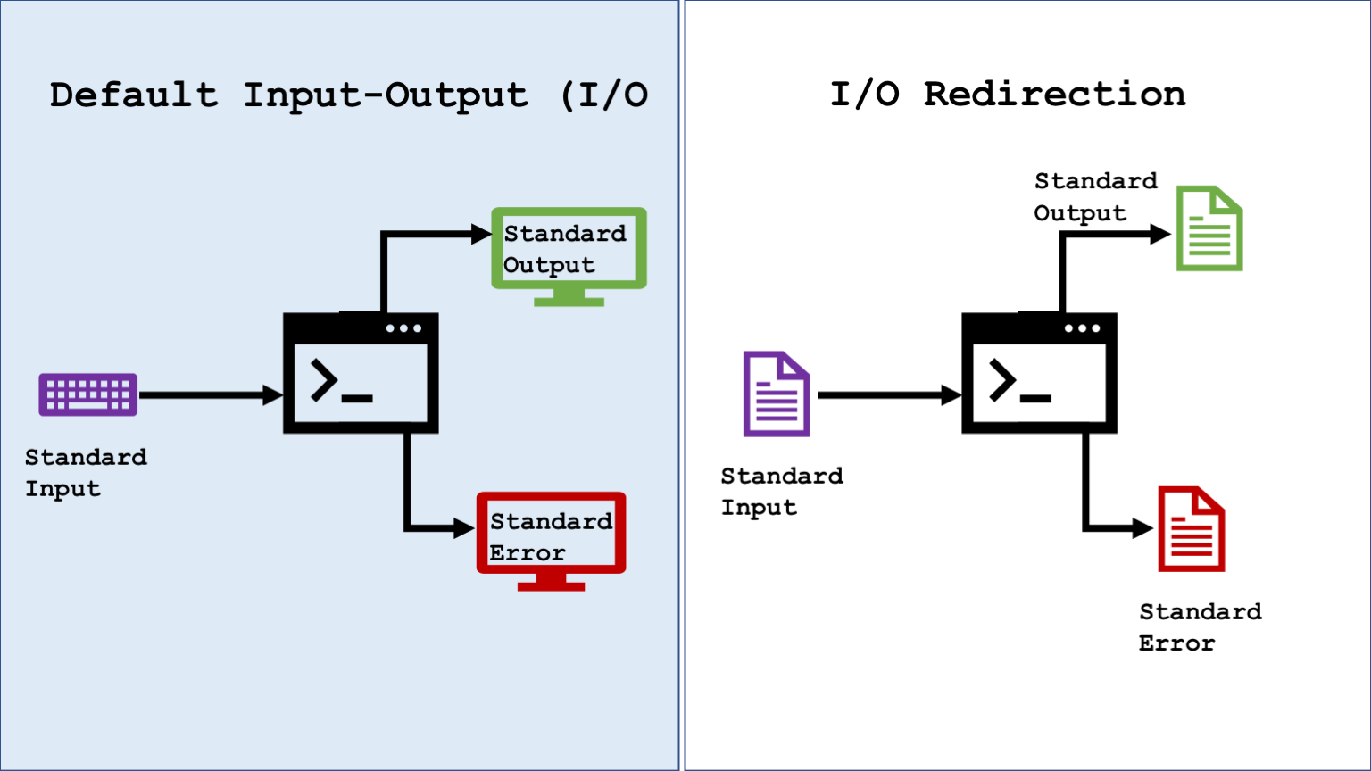 So far, we ran commands that displayed text on screen, be it errors or intended output. In cases like the cp -i command, the system expects user input to continue the execution. The system uses the keyboard as Standard Input and the monitor as Standard Output and Standard Error.